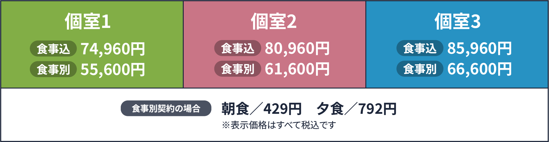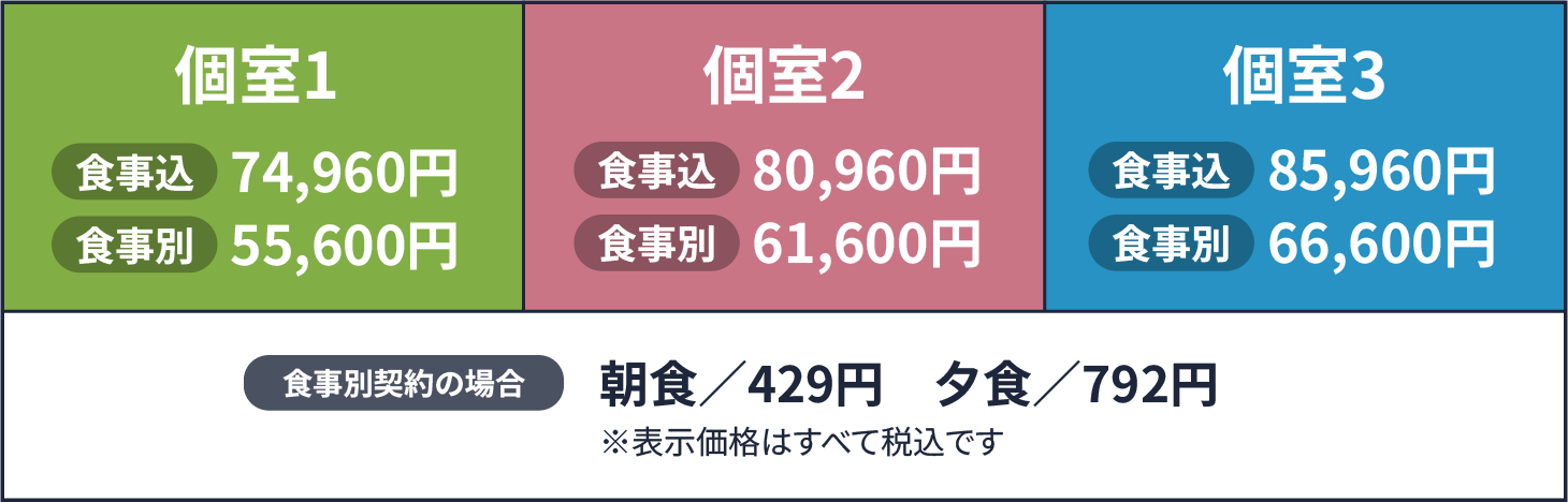 ※館費、入館費、保証金、月間管理費には消費税はかかりませんが、通信設備料、食事料金には消費税が別途必要となります。